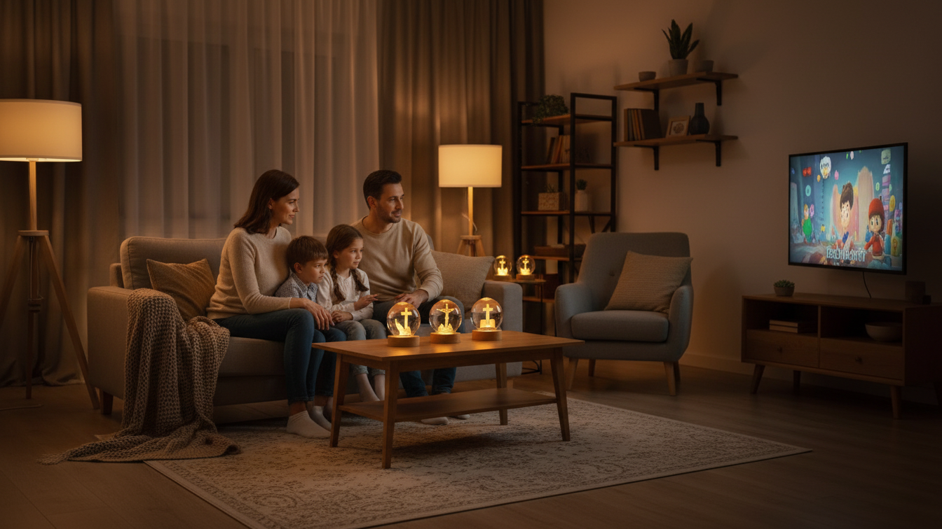 The lamp produces a soft, warm glow designed for calm and relaxation, not harsh brightness.